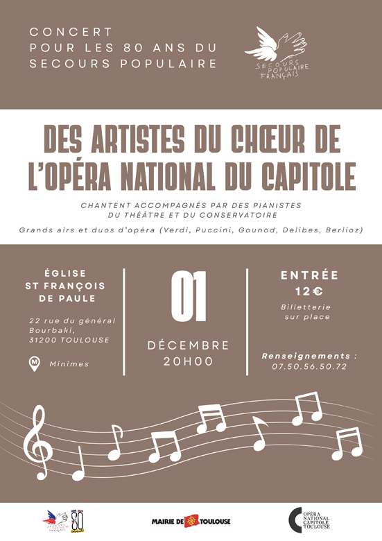 À l’occasion des 80 ans du Secours populaire français de Toulouse, des artistes du chœur de l’Opéra national du Capitole et des pianistes du Théâtre et du Conservatoire offriront un grand concert, le lundi 1er décembre à 20h00, à l’église Saint-François de Paule des Minimes (22, rue du Général Bourbaki). Une soirée placée sous le signe de la musique et de la solidarité. Le programme rendra hommage aux grands maîtres de l’opéra : Verdi, Puccini, Gounod, Delibes et Berlioz, à travers une sélection d’airs et de duos emblématiques. Dans le cadre de cet anniversaire, ce concert souhaite unir la musique et la solidarité en rendant hommage à quatre-vingt ans d’engagement du Secours populaire auprès des plus démunis. Une soirée où la beauté des voix se mettra au service d’une grande cause. Le prix de l’entrée est de 12,00 €, et l’ensemble des fonds récoltés lors de cette soirée seront reversés au Secours populaire français de Toulouse.